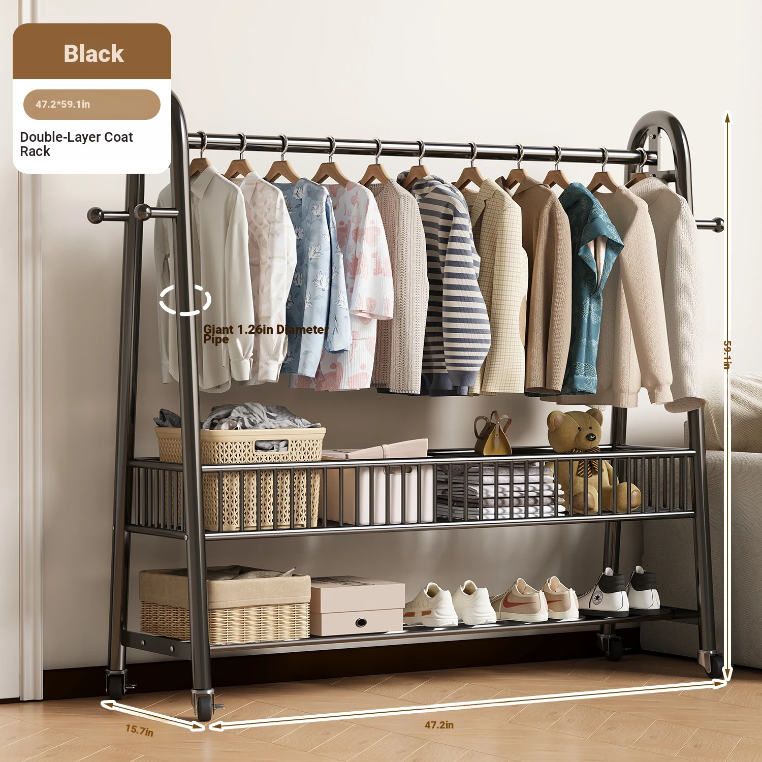 [Giant Thick 32 Tube-Double Rod Clothes Drying] Classy Black 47.24in*74.80in-Wheel Delivery