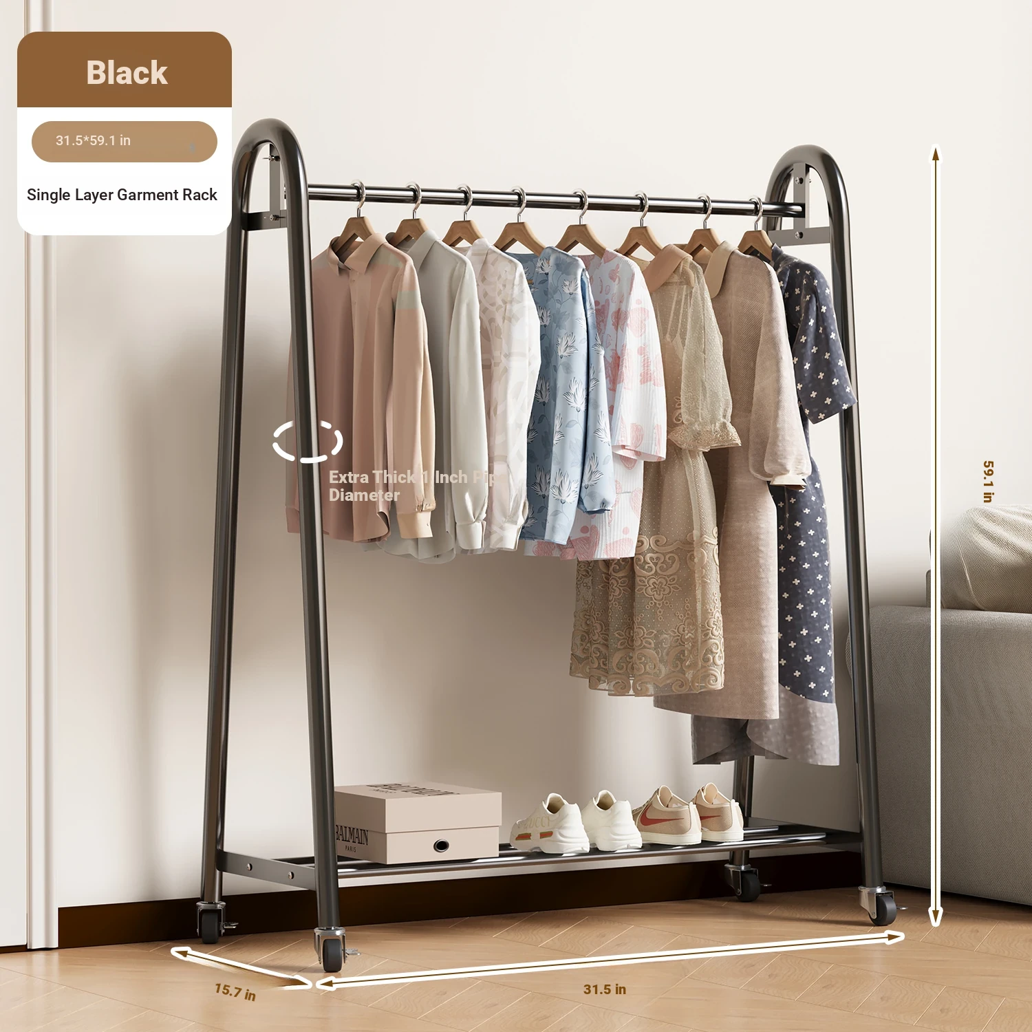 [Giant Thick 32 Tube-Double Rod Clothes Drying] Classy Black 31.50in*74.80in-Wheel Delivery